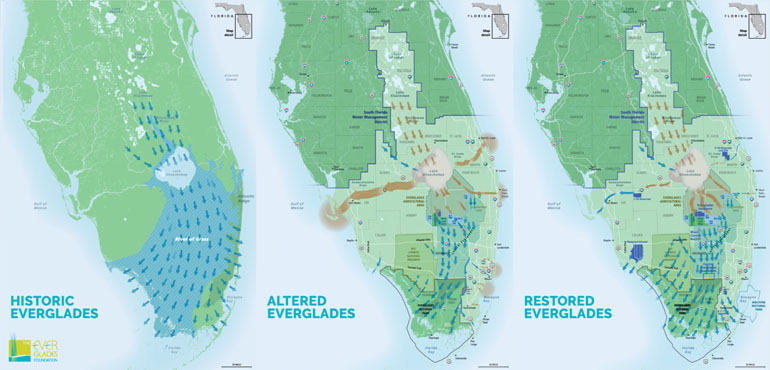 This project entailed creating a highly detailed map of South Florida's Everglades area, then animating each to show the flow of water from north to south, during pre-industrial times (Historic), Current, and with future Restoration projects included. They were then set up as individual animated maps, one fading into another, and all three side-by-side, to give the client maximum flexibility for different ways in presenting them. Static print versions and for posting on the Web were provided as well. The maps were created using Adobe Illustrator and the animation with After Effects.