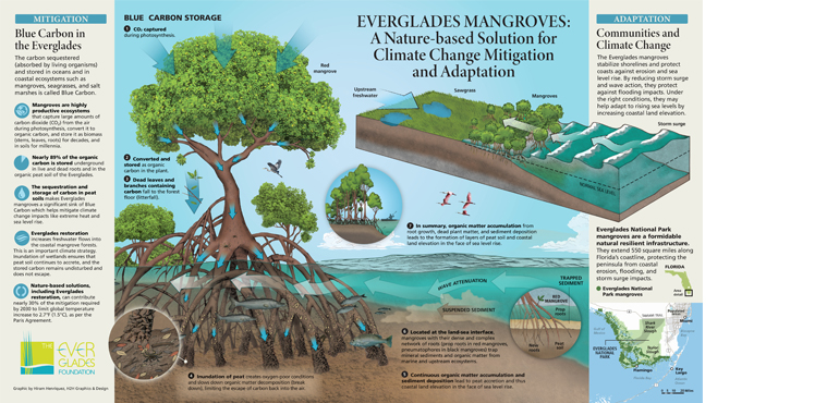 Hand drawn illustrations and infographic design related to how the Everglades mangroves are a nature-based solution. For climate change mitigation and adaptation.